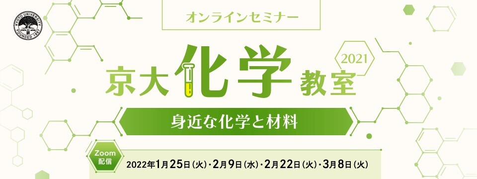 第2回となる今回は、「材料」をテーマに4名の講師が登壇します。材料の研究・開発は縁の下の力持ち的な存在と思われがちですが、実は非常に重要で、身近な生活との関わりも強く、最先端のものづくりに直結する研究分野です。スマホ・電気自動車などに使われている材料とその役割、地球に優しい材料、今までの常識を覆す材料の応用方法、古い技術が新しい技術となるのかなど、炭素材料化学、有機合成化学、高分子科学、固体化学を専門とする京都大学の研究者が、最先端の技術について分かりやすく紹介します。
