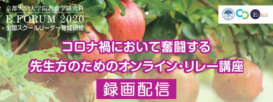 京都大学大学院教育学研究科 E.FORUM は、広く教育に関⼼を持っている⼈びとが集まり、ともに語り合うことを通して、お互いの教育⼒量を向上させることを⽬的とした「広場」です。新型コロナウィルス感染症の影響により、社会環境の変化、オンライン授業の実施、子どもたちへのケアなど、多くの先生方が今まで経験されたことのない状況のなかで奮闘されていることと存じます。E.FORUMでは、そのような先生方のお悩みを少しでも解決できないかと考え、オンラインによるリレー講座を2020年7月から8月にかけて、4回に渡り開催いたしました。